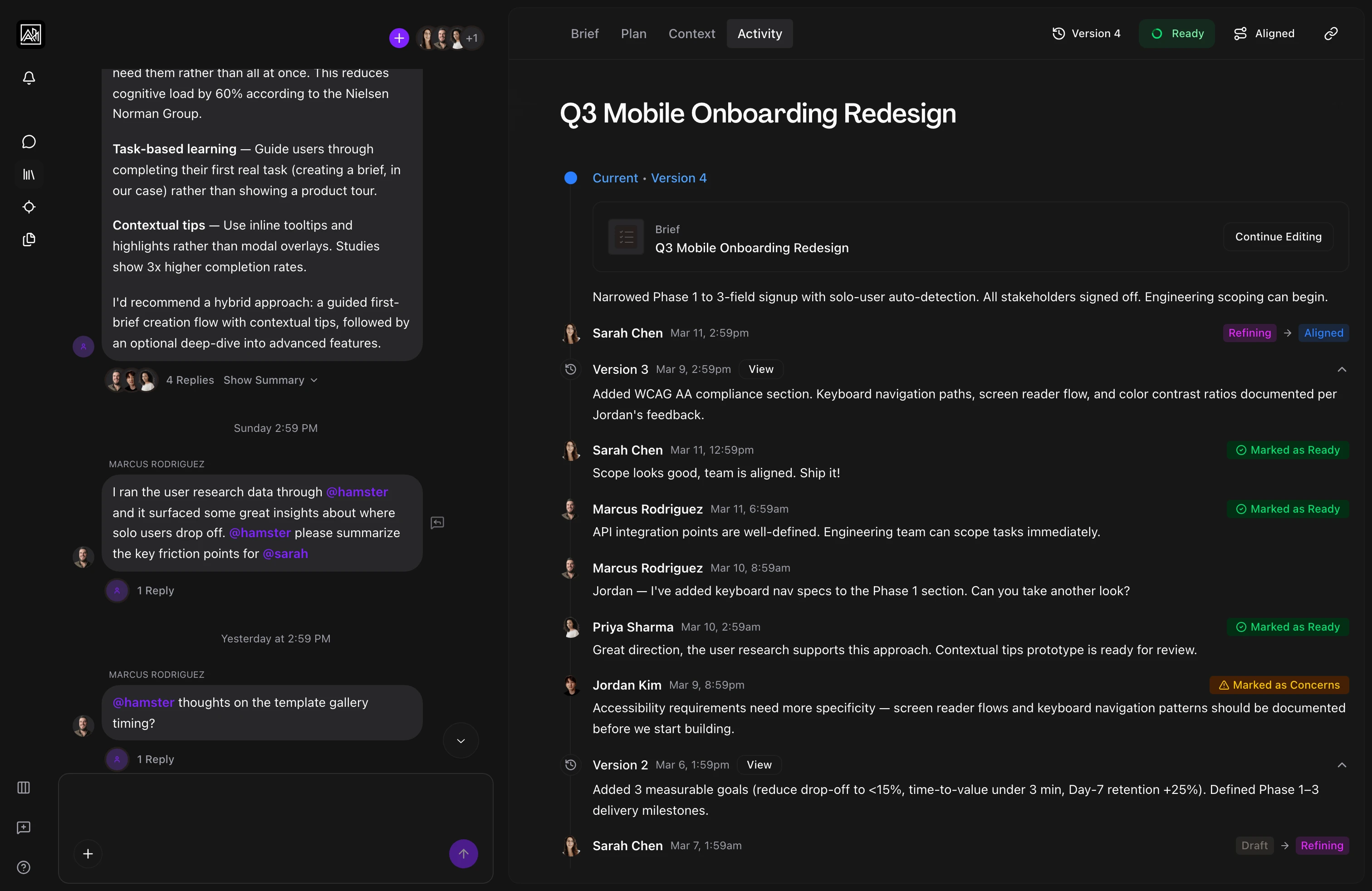 Mention team members and the AI assistant: The @mention picker includes all team members plus the Hamster AI assistant. Direct a question or task at the AI the same way you would a human teammate.