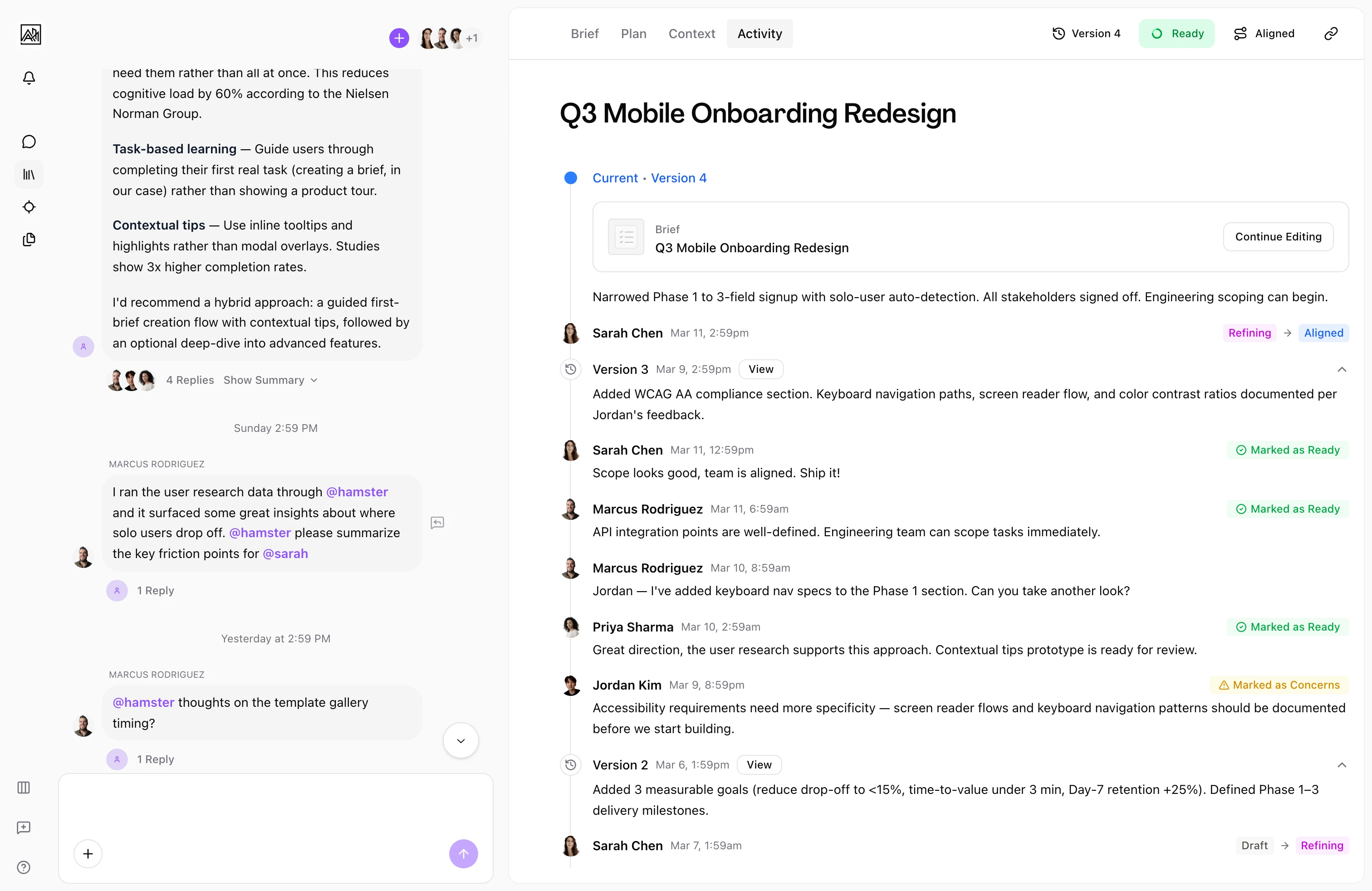 @mention teammates inside documents and conversations to bring their attention to specific content, and receive notifications when you're mentioned or when something you care about changes.