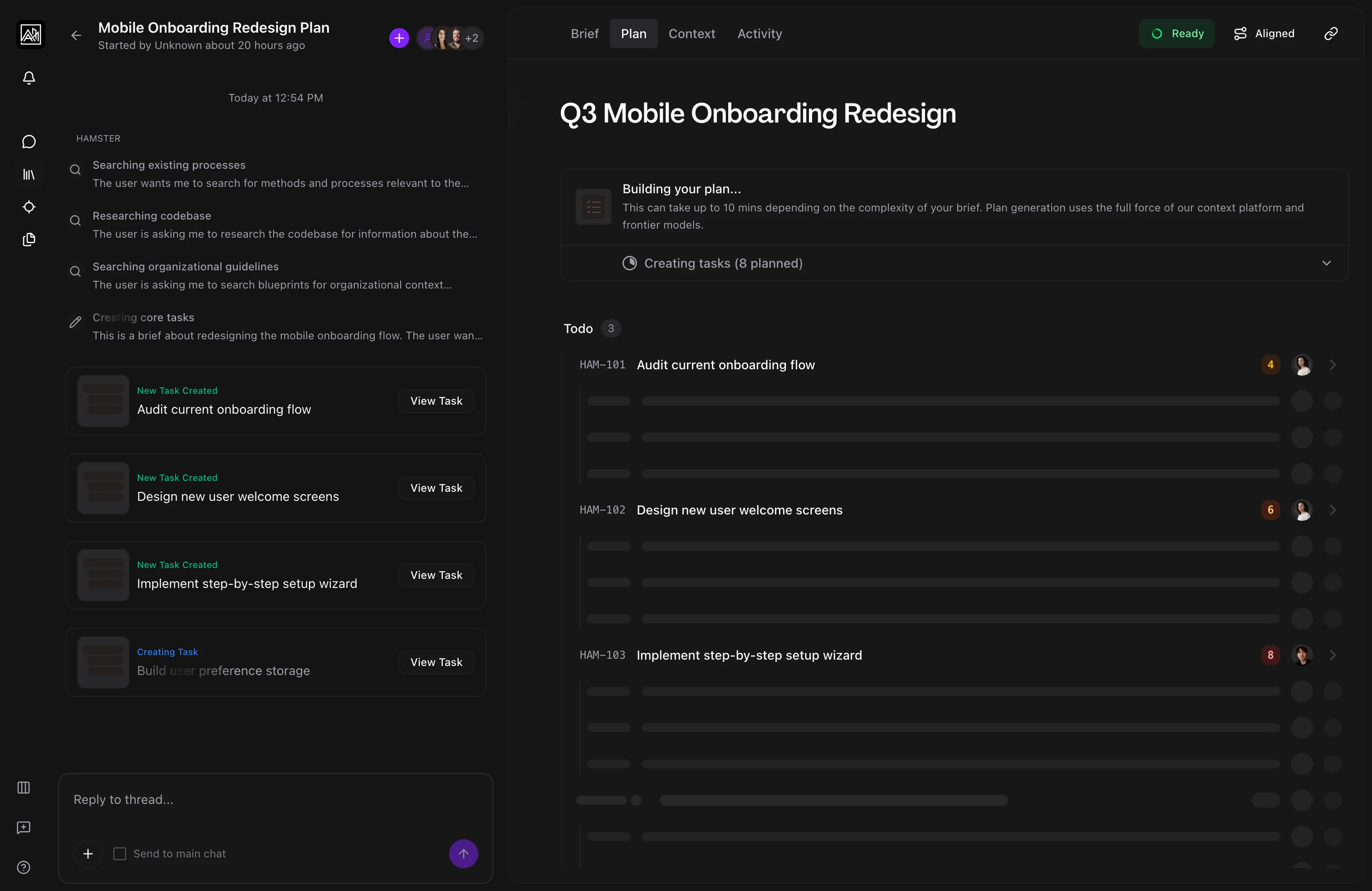 Context-aware generation: Before creating tasks, Hamster searches your blueprints, methods, connected tools (including Figma designs if connected), and your codebase. The plan reflects your team's actual patterns and existing work, not a generic breakdown.